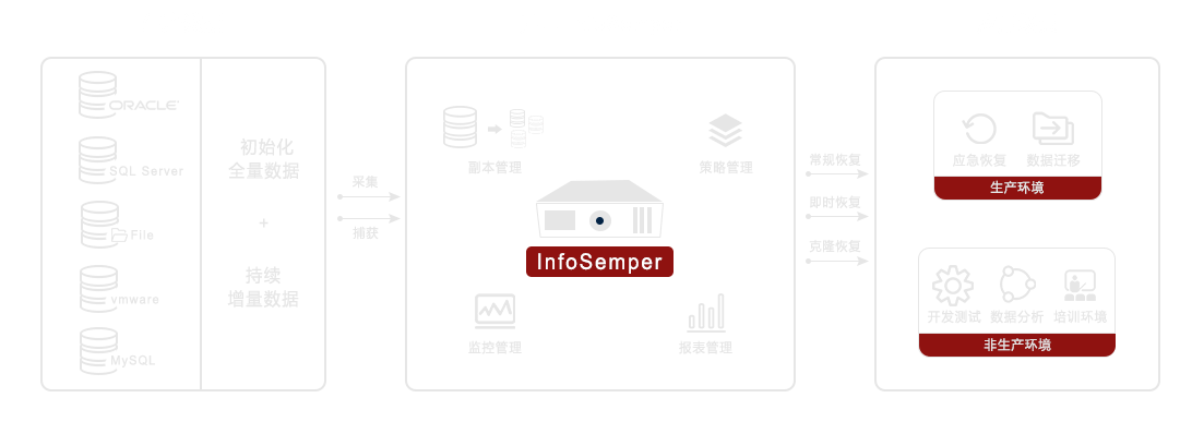 基于應(yīng)用系統(tǒng)的標(biāo)準(zhǔn)化接口捕獲生產(chǎn)環(huán)境中的文件、數(shù)據(jù)庫、虛擬機(jī)等數(shù)據(jù),基于快照技術(shù)建立多副本管理體系,