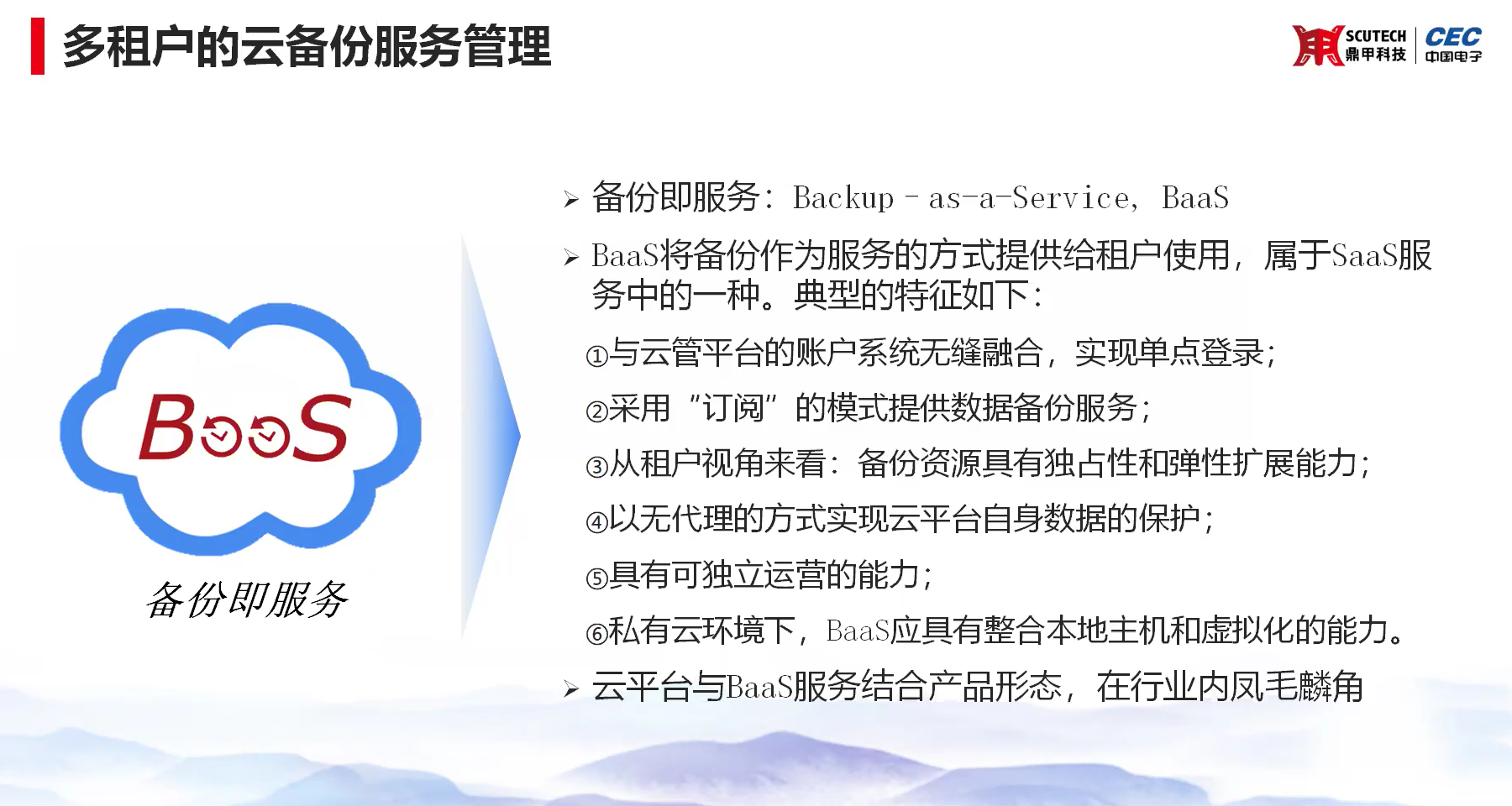 那BaaS的服務呢,叫備份即服務。它將備份以服務的方式提供給租戶使用,以無代理的方式實現云平臺的自身數據保護。