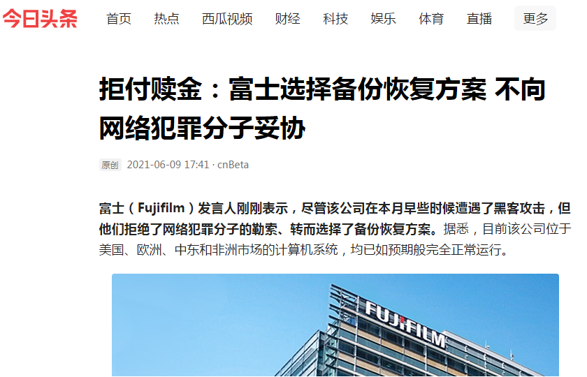 6月1日,黑客盯上了日本的富士(Fujifilm)公司,富士在自家網絡系統內發現了源于外部的未經授權訪問,遭到了勒索病毒攻擊。