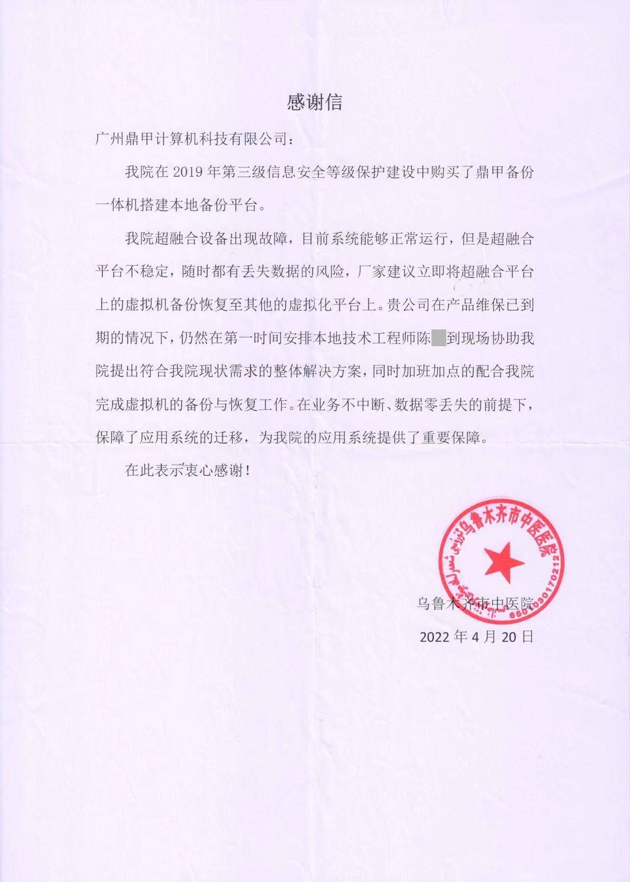 數據零丟失,鼎甲說到做到,喜獲烏魯木齊市中醫醫院感謝信!