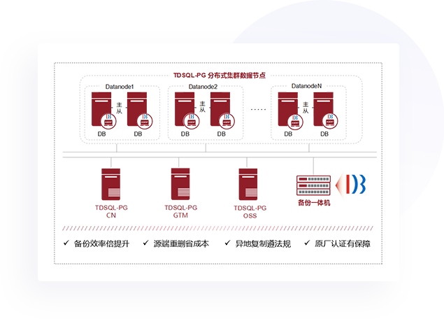 鼎甲與騰訊云聯(lián)合改造 TDSQL-PG(TBase)的 OSS(平臺(tái)管理系統(tǒng)),在騰訊 OSS 界面上增加了一種名為“鼎甲存儲(chǔ)”的備份存儲(chǔ)介質(zhì)。打通與 DBackup 數(shù)據(jù)傳輸?shù)耐ǖ溃瑢?shù)據(jù)直接備份到 DBackup 的存儲(chǔ)池。實(shí)現(xiàn)了 TDSQL-PG 的集群級(jí)別無(wú)緩存?zhèn)浞莺突謴?fù),支持重復(fù)數(shù)據(jù)刪除和數(shù)據(jù)遠(yuǎn)程復(fù)制,提升數(shù)據(jù)的備份效率,以更便捷的方式對(duì)數(shù)據(jù)庫(kù)實(shí)現(xiàn)備份管理,共同為用戶提供更敏捷安全的數(shù)據(jù)保護(hù)解決方案,助力千行百業(yè)數(shù)字化轉(zhuǎn)型。