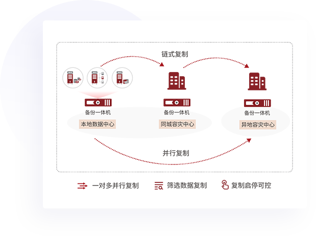 DBackup 為適應(yīng)多種容災(zāi)場(chǎng)景,新增支持存儲(chǔ)池的一對(duì)多并行復(fù)制,可直接將本地?cái)?shù)據(jù)中心的數(shù)據(jù)并行復(fù)制到多個(gè)容災(zāi)中心,當(dāng)本地?cái)?shù)據(jù)中心出現(xiàn)故障時(shí)可指定同城或者異地容災(zāi)中心進(jìn)行數(shù)據(jù)的快速恢復(fù),豐富了異地容災(zāi)的多樣性和可靠性!用戶還可按資源、備份類型篩選出核心數(shù)據(jù)進(jìn)行復(fù)制,減少不必要的存儲(chǔ)和帶寬成本,從而提升池復(fù)制的時(shí)效性,幫助用戶更高效安全地搭建兩地三中心方案!