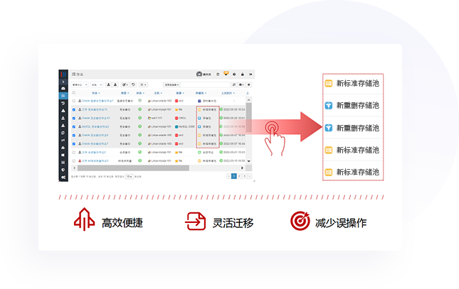 針對(duì)存儲(chǔ)設(shè)備空間即將耗盡或測(cè)試轉(zhuǎn)正式環(huán)境場(chǎng)景,DBackup 新增一鍵遷移到新存儲(chǔ)設(shè)備功能。通過(guò)批量設(shè)置和智能判斷原備份目標(biāo)機(jī)制,讓運(yùn)維人員告別機(jī)械重復(fù)操作,輕松完成備份目標(biāo)遷移工作。