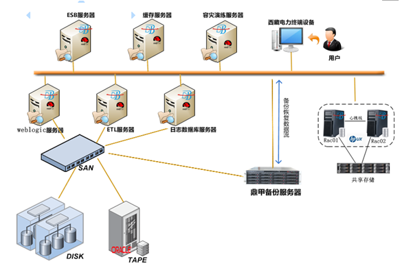 西藏電網營銷基礎數據平臺由多臺業務服務器組成,包括公共數據庫服務器,日志數據庫服務器,基礎Weblogic應用服務器,ETL服務器,ESB服務器等。需要實現系統整機備份及關鍵數據的備份。其中需要進行RedHat系統備份8臺,需要備份ORACLE rac的設備2臺。另有凝思磐石操作系統1臺需要進行整機保護。需要實現操作系統全量備份、增量備份;數據庫的完全備份、增量備份;要求實現D2T,D2D2T模式,備份數據長期保存于Oracle 磁帶庫。