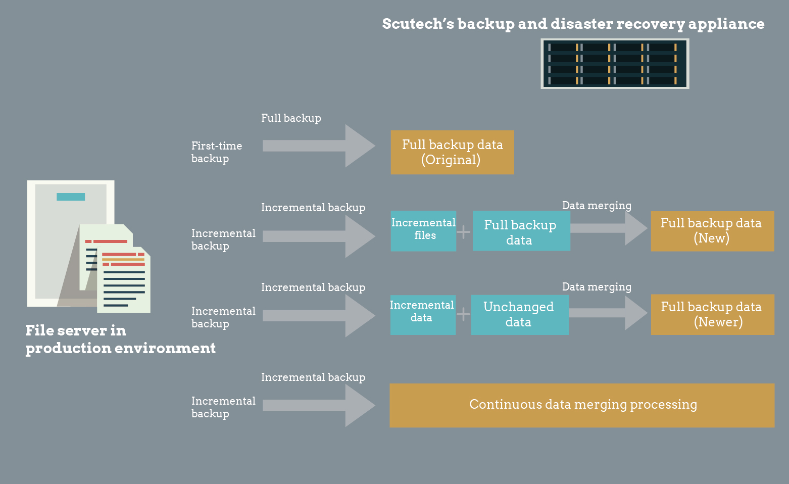 Scutech applies variable-length partitioning for non-structured data especially for backup of massive small files. Due to frequent changes of small files, a fixed-block partitioning will often result in repartitioning the whole backup, while variable-length partitioning targets only changed data, which occupies less computing resources and obtains optimal deduplication result as well.